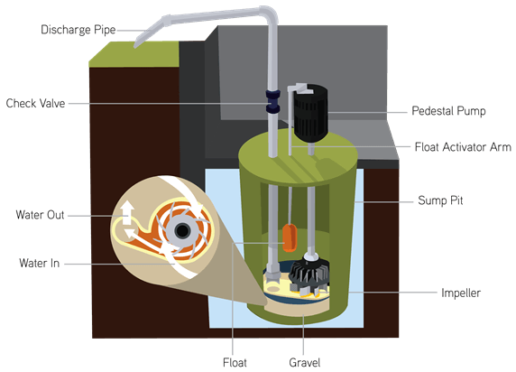 Once a certain water level is reached in the basin, your sump pump will kick in to pump the water out of your home and into the drainpipes.